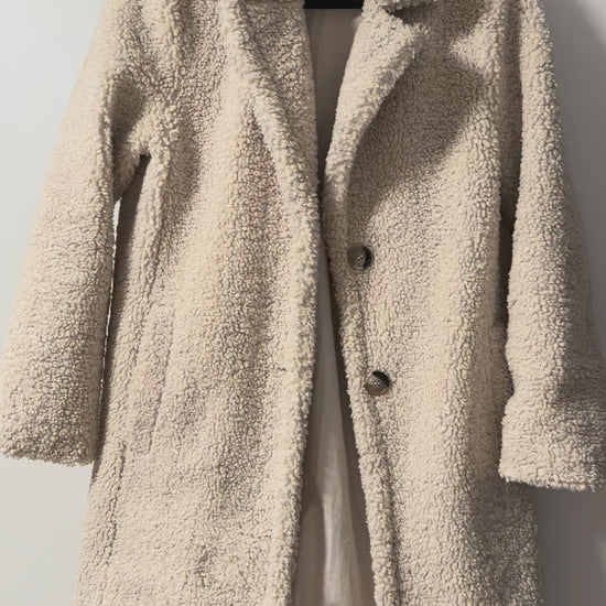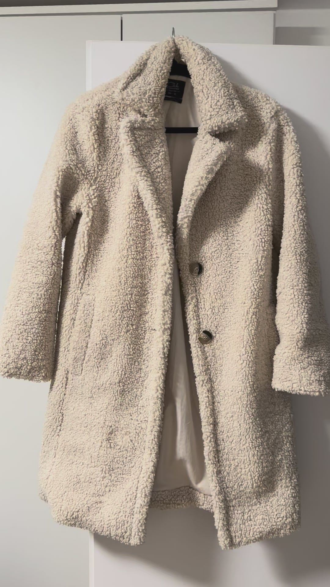 Cozy and effortlessly chic, this beige Teddy coat is the perfect blend of comfort and style. With its soft, fluffy texture and timeless design, it keeps you warm while adding a touch of elegance to any outfit. A must-have statement piece for the colder days.