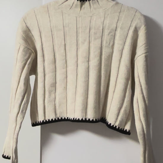 Stay cozy and chic with this soft beige sweater featuring vertical ribbed texture for a flattering fit. Designed with a high neckline and finished with delicate black trim on the collar, cuffs, and hem, it adds a subtle contrast that makes the piece stand out. Perfect for pairing with jeans or skirts, it’s a versatile must-have for your everyday wardrobe.