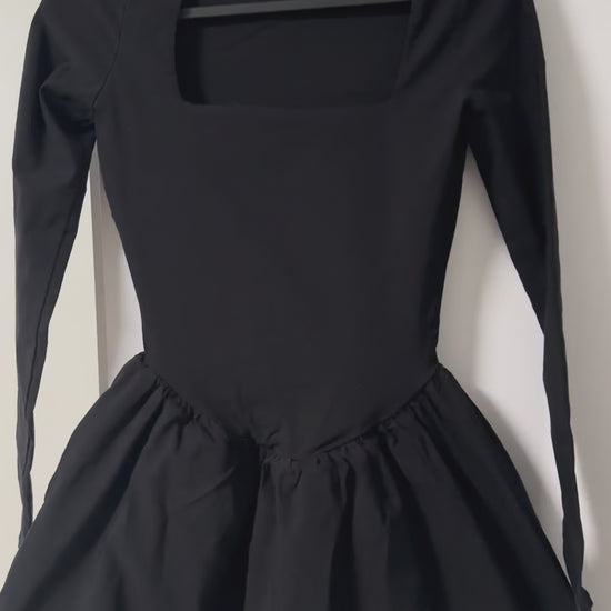Sleek black mini-dress featuring a fitted top and a flirty, voluminous skirt. The dramatic volume of the skirt and the short length perfectly balance the height of the 177 cm (5'10") model, creating a timeless and elegant outfit.