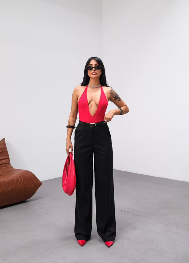 Upgrade your wardrobe with our sleek black high-waisted trousers. Designed with a tailored fit and wide-leg silhouette, these