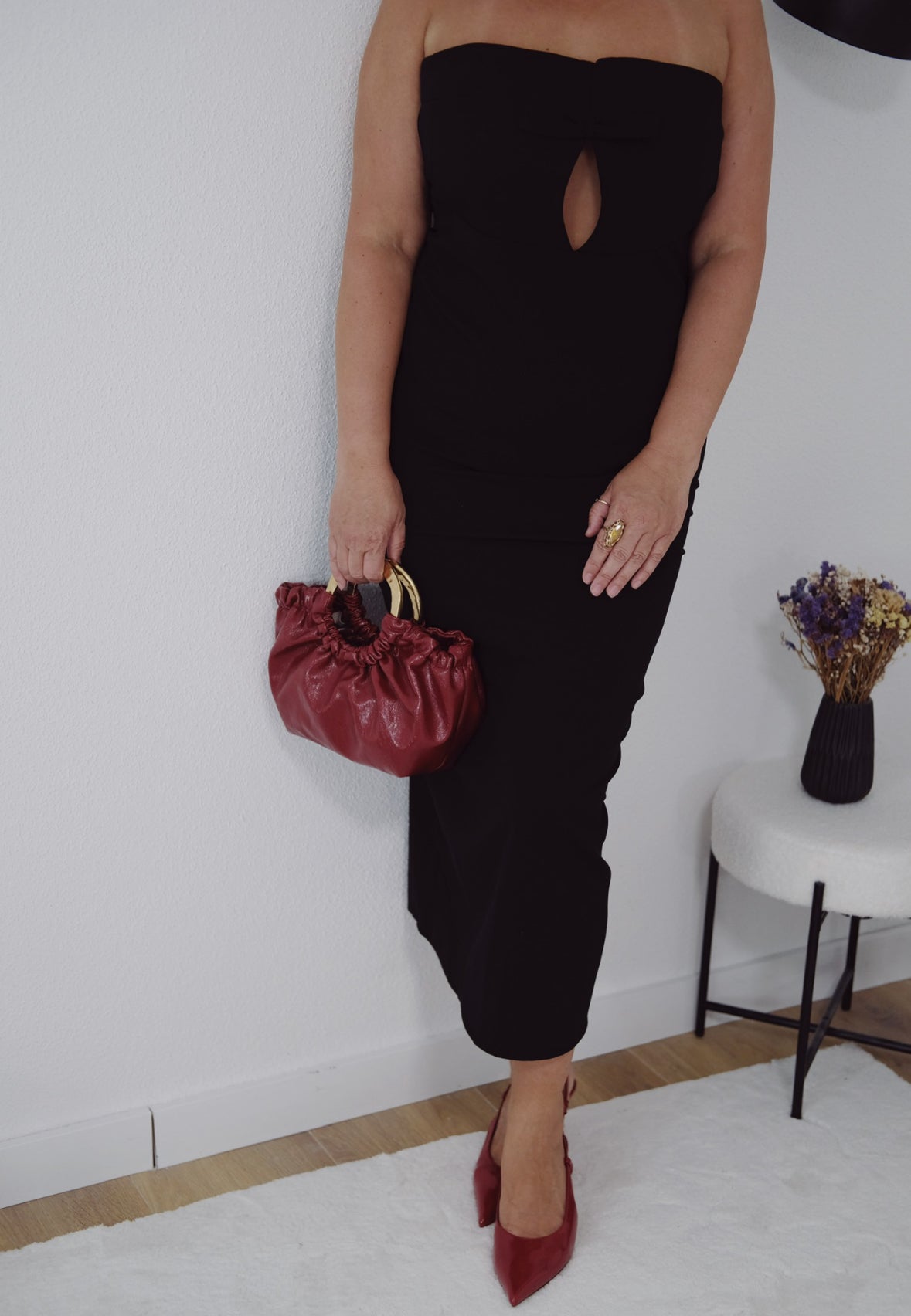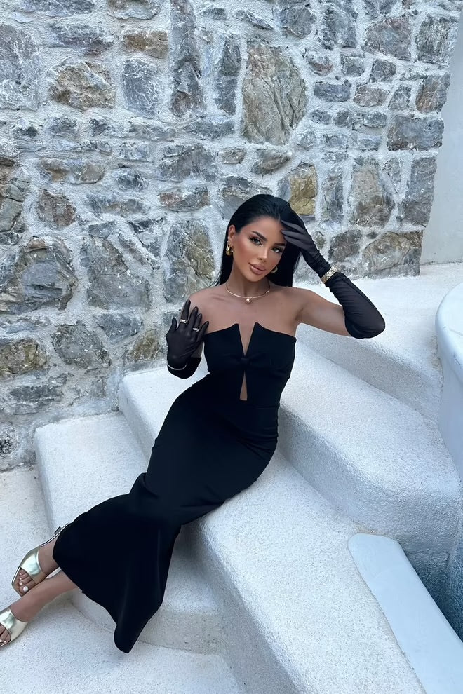 Make an unforgettable entrance in our stunning black maxi dress. Featuring a strapless neckline, delicate front cut-out, and a chic