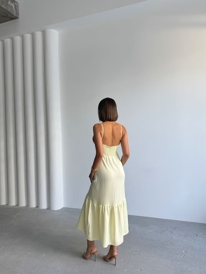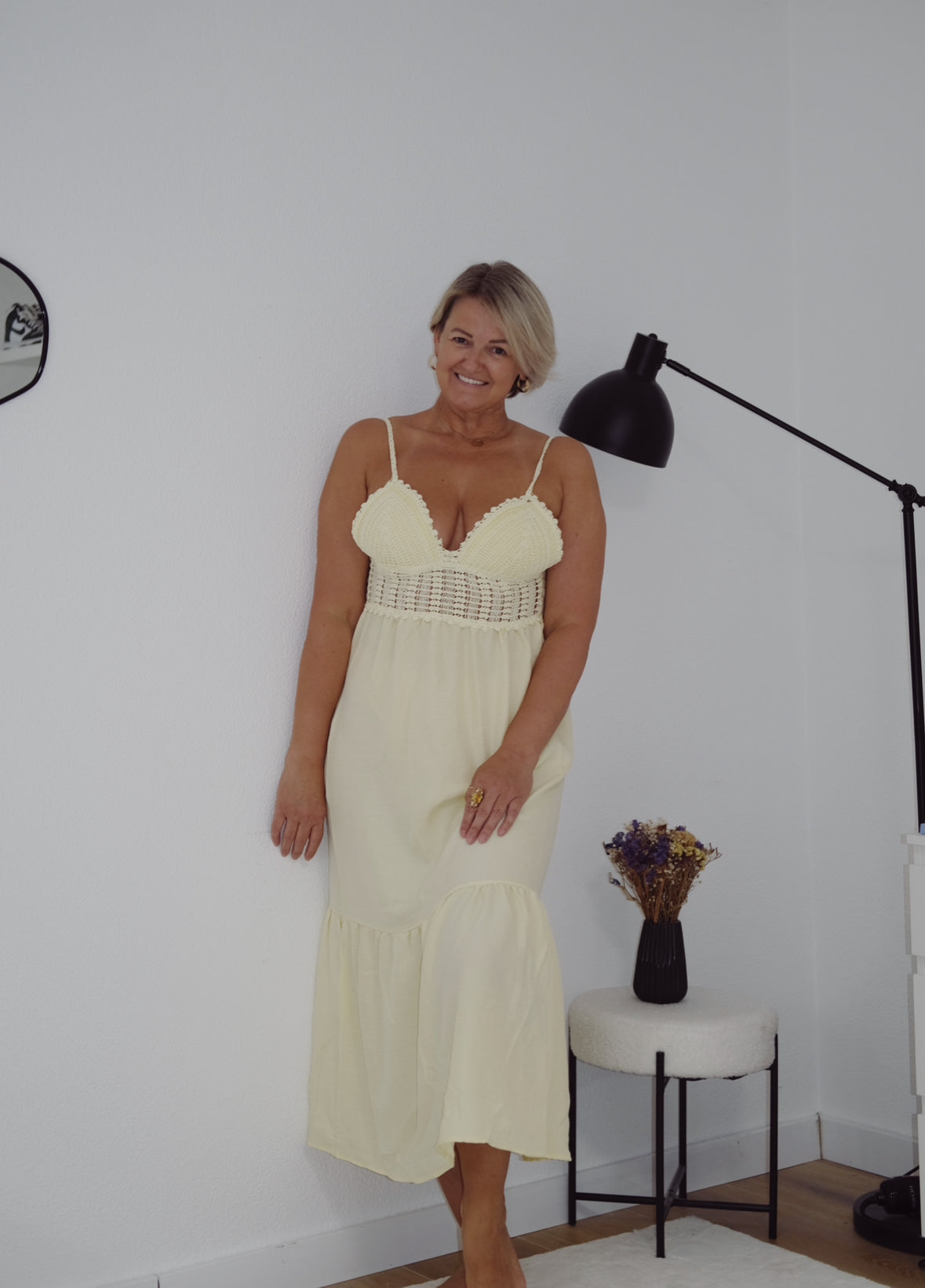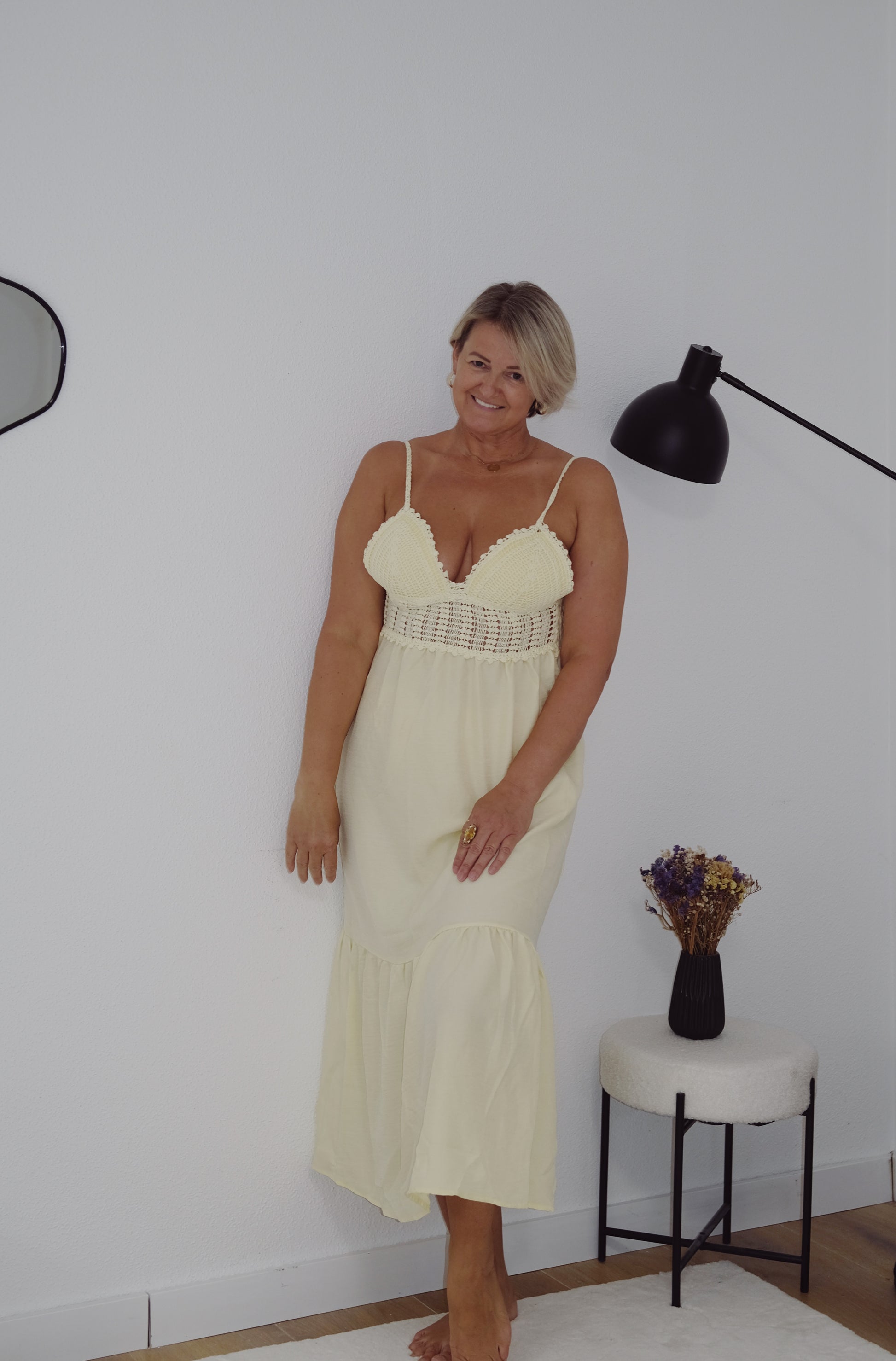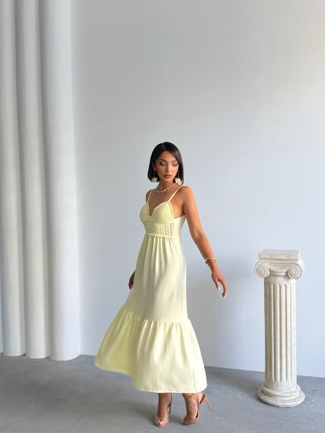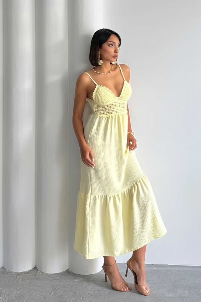 This pastel yellow midi dress features a delicate crochet top with adjustable straps and a flowy, crinkled skirt that moves beautifully