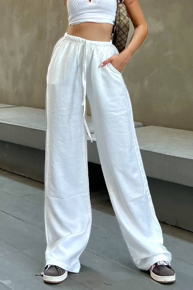 These relaxed-fit white trousers combine streetwear edge with summer ease. Crafted from a breezy linen-blend fabric, they feature a wide-leg silhouette, high-rise elastic waist with drawstring, and side pockets for laid-back comfort wherever you go.