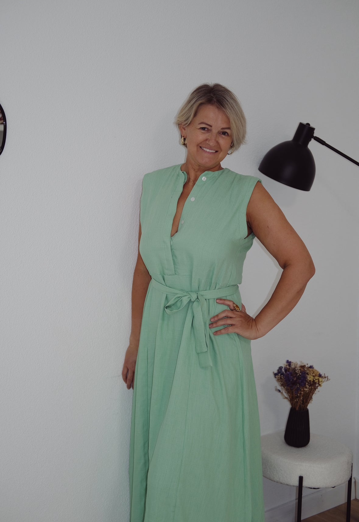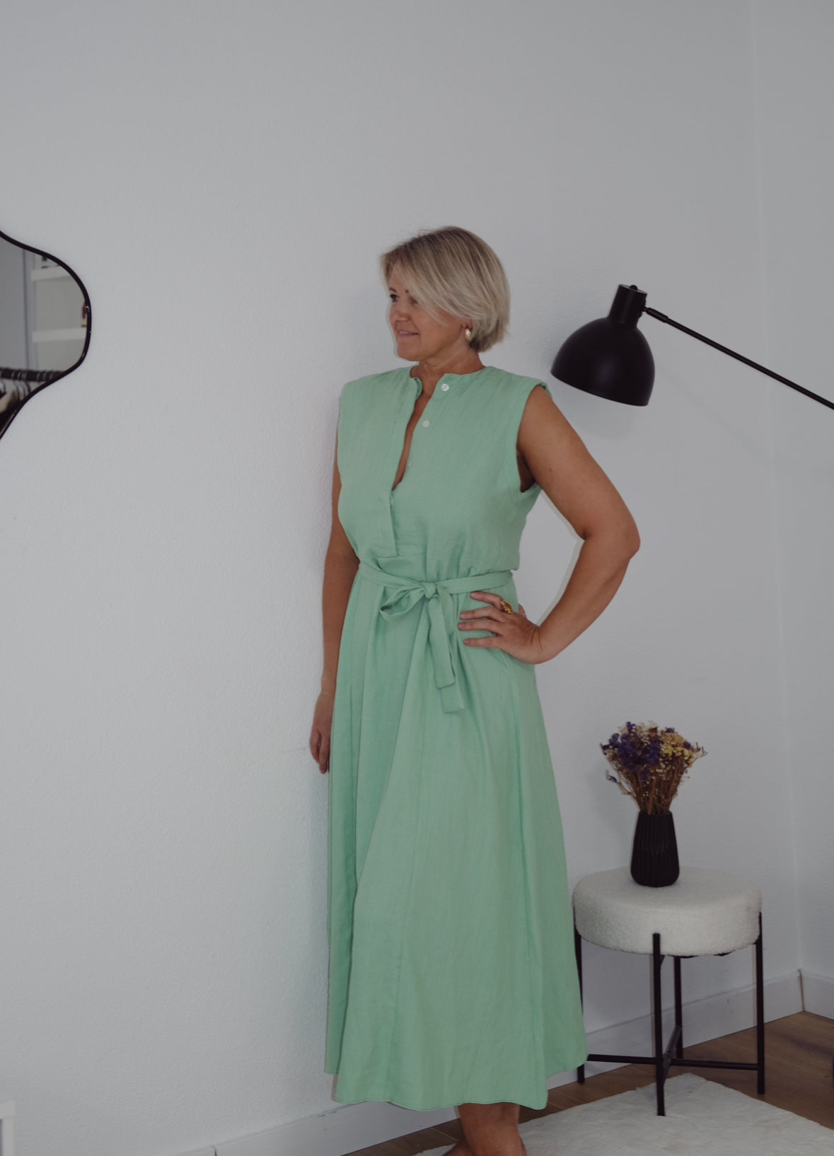 This sleeveless mint green shirt dress is designed with a button-up neckline, flowy A-line silhouette, and a matching tie belt to