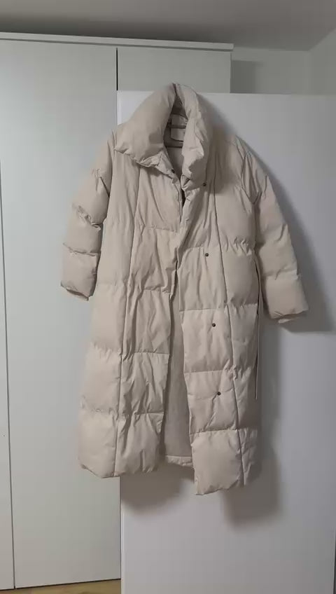 Step into winter in style with our Oversized Cream Longline Puffer Coat – a statement piece that blends comfort, elegance, and warmth.