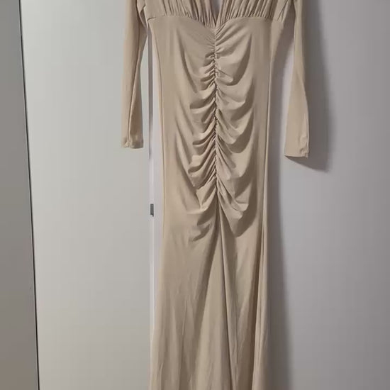 Crafted in a luxurious cream-beige tone, this dress features a plunging neckline, flattering ruched detailing along the waist, and long fitted sleeves for a perfect silhouette. The midi length flows gracefully with every step, making it ideal for both evening occasions and elevated daytime looks.